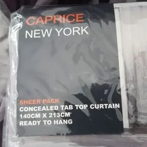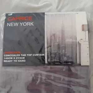 2 packets of sheer tab top curtains in a smoky grey very sheer material with the image of New York. one packet opened but both NWOT size 140 x 213 ready to hang