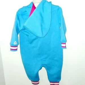 BRAND NEW (with tags) ADORABLE, long-sleeved one-piece baby romper from Reebok. Style is called "Reebok BG Romper". Color is 'Blossom Blue'. COZY, extra SOFT, attached hood. BRIGHT and CHEERFUL colors!! PRETTY blue romper features deep fuscia pink and white details at ribbed, elastic cuffs and hem. Brand name/logo also stand out in contrasting deep fuscia pink and white. Attached hood is lined in matching fuscia pink. Full zip front for easy on/off and diaper changes. SNUGGLY SOFT and SUUPER COMFY Cotton/Poly Blend Fabric. Easy Machine Washable. Size 3-6 Months. NWT. Never Worn.