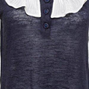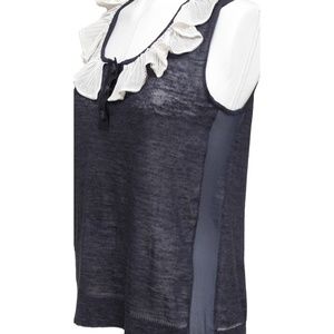 - Lightweight sleeveless navy silk blend top with ivory ruffle around neckline.