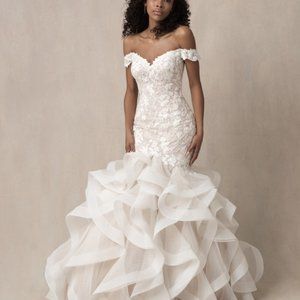 Allure Bridal Gown Style 9859 has a dramatic balance achieved by pairing a bodice of appliquéd blossoms with the volume and structure of a ruffled skirt.