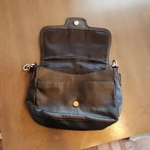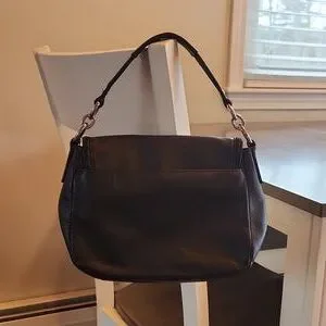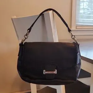 small black leather Coach purse. silver accents. 4 pockets. comes with a longer shoulder strap or can be used as a clutch. shiny snakeskin edging details. magnetic snap closure. great condition.