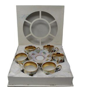 Item has never been used, just decorative in a curio cabinet. Comes with original box. It is a complete 12PC set which highlights wild flowers from region, with a iridescent glossy glaze. Has a Gold trim inside each cup and handle and on each saucer.