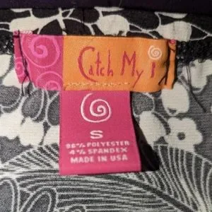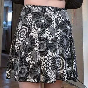 "Catch My i" y2k black and white godet flare midi skirt with a funky floral print reminiscent of 60s mod print. Laid flat waist: 12" but plenty of stretch and fits me with a 30" waist. I am wearing it higher on my waist so its more of a long mini / right above my knee, I'm 5'6".