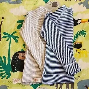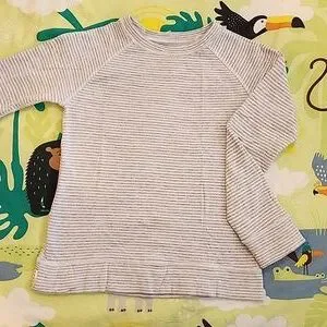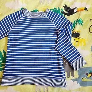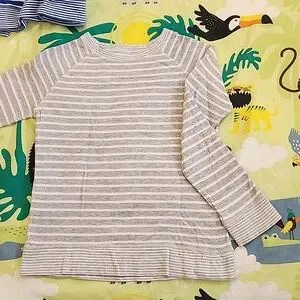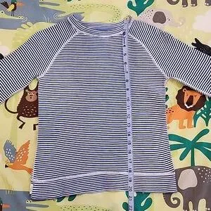 No stains or holes that I was able to see. There is an opening for the tag to get tucked in when you wear on the flip side.