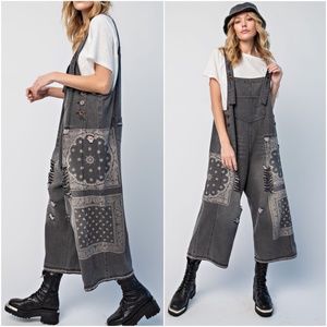 017 Vintage Wash Paisley Print Black Oversized Overalls