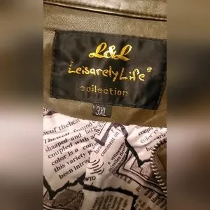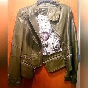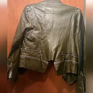 This is a NEW with tags GORGEOUS studded olive green vegan leather jacket by L&L Leisarely Life Collection. This beauty is marked a 3X as it is Asian size fits like a Medium. This is a super cool versatile jacket with tons of zipper and stud detailing. Lined with gorgeous news print silk like lining. The approximate unstretched measurements:
