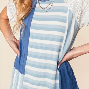 DENIM & WHITE STRIPE COLOR BLOCK SHORT SLEEVE TOP