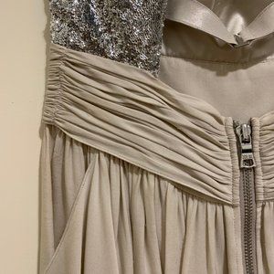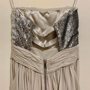 I'm selling this gorgeous Alice + Olivia silver strapless sequin dress in a size 6. The dress is perfect for a cocktail party or other formal event! It is in great pre-loved condition, with some minor pilling from normal wear and slight, barely noticeable discoloration on one of the back straps (please see photos). Please let me know if you have any questions or would like to make an offer :)