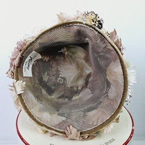 Vintage Miss Kathy New York Neutral Color Silk Floral Velvet Bow Cloche Hat