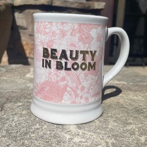 Beautiful pink and white coffee or tea mug, says “Beauty in Bloom”