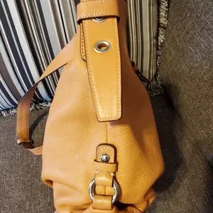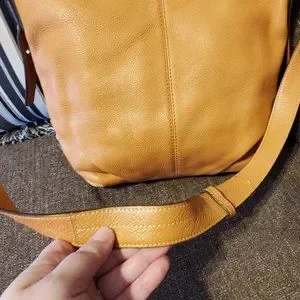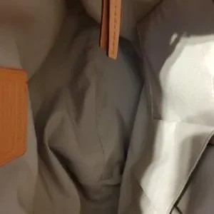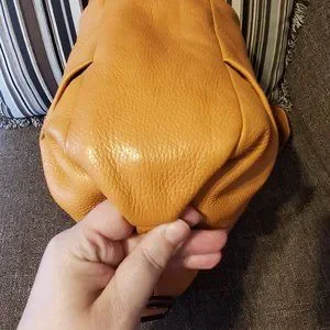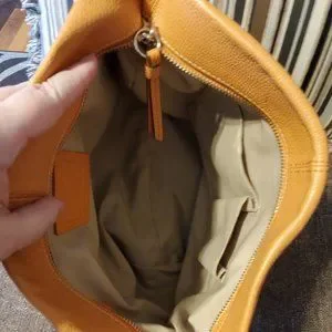 THIS BAG😲😲 is gorgeous. The exterior is a soft Tangerine pebbled leather and has a zip pocket. The strap is flawless. There is a tiny pen mark near the zipper (see pic) and an unnoticeable rub spot (see pic), if you can see it.