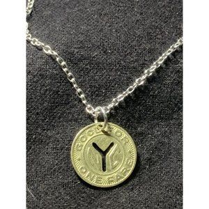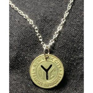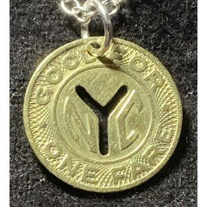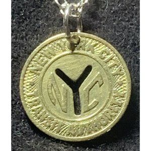 A unique necklace made out an original circulated small size NYC subway token (first used in 1953).