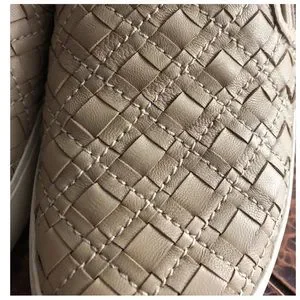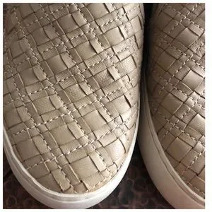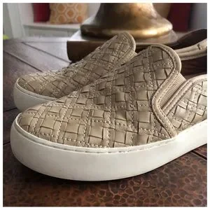 From Frye the Lena Woven Slip On. SIZE 7.5. I would say the color is a light tan/wheat color. Great condition with some overall light soiling to the soles. (There is a dark marking on the right interior footbed. I am not sure what it is but, again it is on the interior footbed so it is not noticeable when worn)