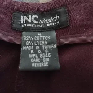Stretch cotton/lycra in size 4P. By INC International. Straight leg, side zip. Dry clean only