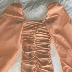 •Long puffed sleeve ruched mesh mini dress