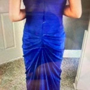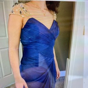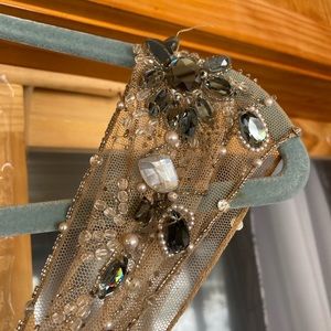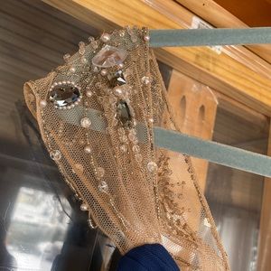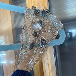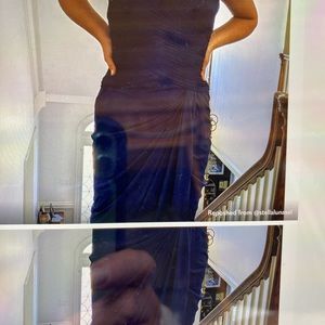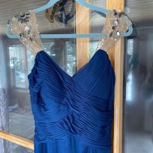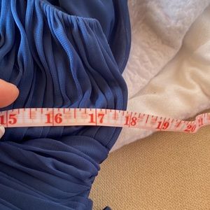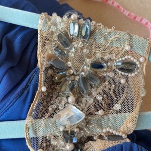 This dress was worn once it did come back from the dry cleaner and it was missing a bead. I did picture that in one of the photos it is a very fragile dress, so I do suggest looking through the beadwork a little bit and making sure everything is secure before wearing there is some nice giving stretch in this dress, I have included pictures of others wearing it so you can get an idea of how the routine is extremely flattering. It is 100% polyester lining and 100% polyester shell great dress for wedding formal event prom, etc