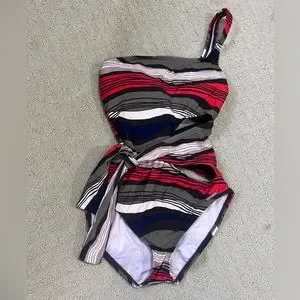 Vince Camuto One Shoulder Striped Cutout One Piece Bathing Suit with tie around waist. Women’s size 6.