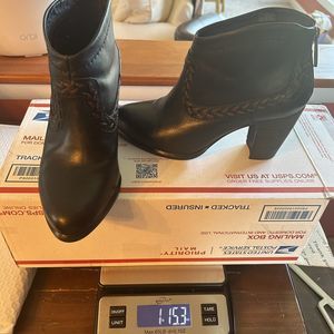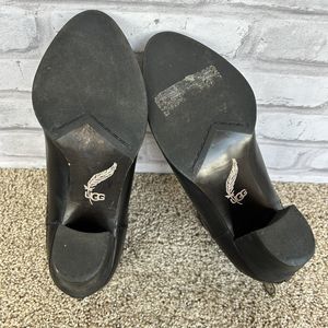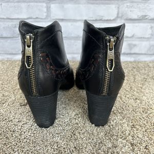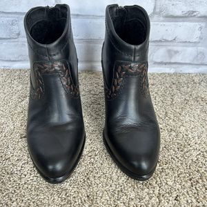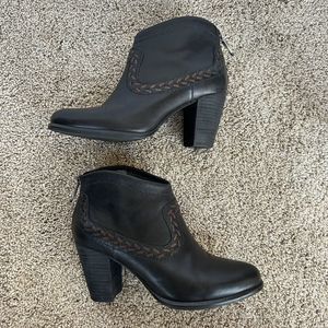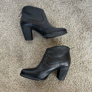 UGG black leather Charlotte ankle booties with brown leather braided trim, size 6. 3 inch heel. Very good used condition - slight wear on the bottom of the heel as pictured.