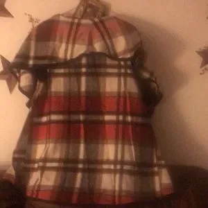 A plaid vest to dress up any pair of jeans or slacks It has a bib like draping own the front and a bib hanging in the back