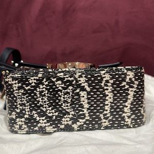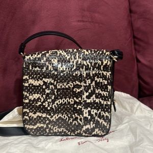 Authentic limited edition - Salvatore Ferragamo; Napa leather with snake embossed print. Two pockets in the inside and large outside pocket with magnetic closure for easy, accessible storage of phone and keys. Main compartment has a snap lock closure with press release. Mirror case is attached and tucks conveniently in a fit for purpose slot. This bag is a show stopper.
