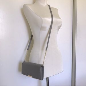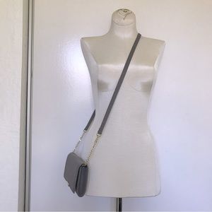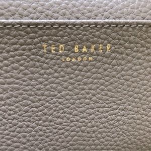 Lovely light grey toned taupe crossbody bag by Ted Baker London. Gold hardware Flap opening. Credit / ID card inserts. Pebbled leather. Elegant and sophisticated, this versatile crossbody bag would be a staple in any closet or capsule wardrobe.