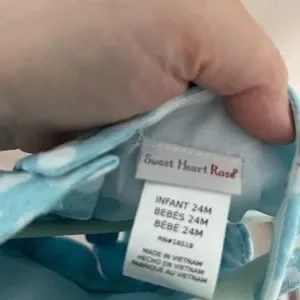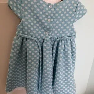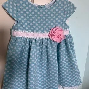 So cute, blue with Polka dots with a pink ribbon and flower accent. Buttons and ties in the back. Like new! Size 24 months