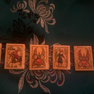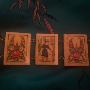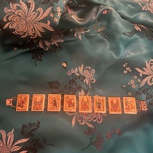 This piece is very old. The bracelet is made up of (8) panels. In all of my travels I have never seen another one. Bracelet is very sturdy and wearable. Clasp is from the 1930’s. Length is 7 & 1/2”, with is 1”. There is some wear, but for age, is in excellent condition. It is hard to find old jewelry that is wearable. 🌺