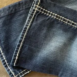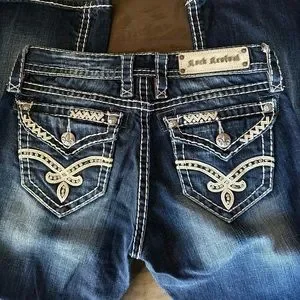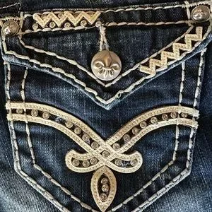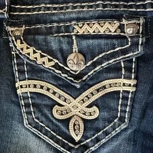 EUC. Dried inside out, only for short time. Small gems on pockets missing, see photos. Not noticed when wearing. No holes or tears. Measurements of waist, leg opening, hip & rise included in photos. 🚭