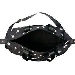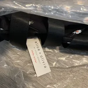 Alice + Olivia bag, black with daisies on it. Zipper still wrapped in styrofoam, in plastic bag, never opened or used. Zip up closure with2 handles and also a cross body strap which is removable. Inside zipper up pocket as well.