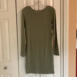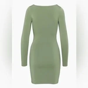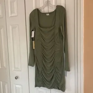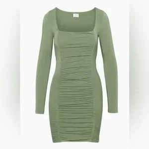 This is a ruched mini dress with a double square neckline. It’s made with Relux Jersey, an ultra-soft and drapey fabric that uses TENCEL™ Lyocell.