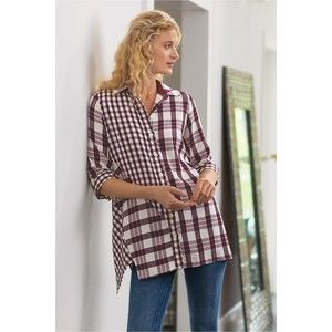 Soft Surroundings Huntleigh Plaid Gingham Asymmetrical Twill Tunic Shirt Size Medium, Burgundy and White/Ivory, Flat Squarish Translucent Buttons up front and back, 3/4 Sleeves, collared, Asymmetrical plaid design, Great Used Condition, No Flaws to Note