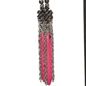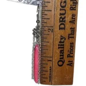 💗Handmade by me with love! These are a uniquely designed chandelier pair of earrings. I featured a celtic-type knot charm, and from that I hung 4 chains. For a nice flash of color, I dangled a dyed bubble gum pinkHowlite Dagger Bead in the middle to peek through. All components are silver plated, including the French hooks. I will include a discreet rubber backing so you won't ever have to worry about losing these. See pics for up close details & measurements. If you love these, check out the last photo in this listing for other colors available in my shop! (sold separately) These are one of a kind, once they are gone they are gone! So bundle your favorite colors before they're all sold out!