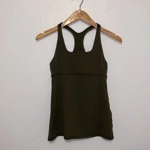 lululemon athletica Tank with Built in Shelf Bra. Slits for removable padding. Green and black. Reflective logo. Stretchy. Size 4 (with size dot and partial tear tag). Pre-owned; Good condition.