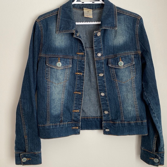 Levi’s 725 Originals jean jacket with lots of beautiful rhinestone buttons. Ladies medium but fits more like a small with good arm length. So unique and cute. Perfect used condition. More of a youth fit. Nice for a teen. I love the buttons.