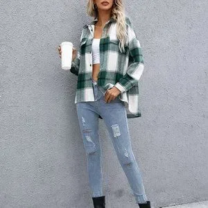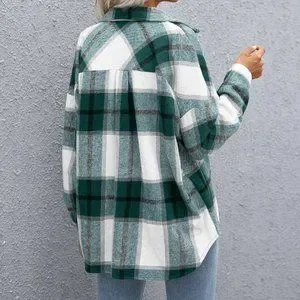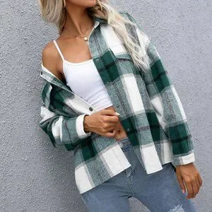 Green Casual Womens Plaid Flap Pocket Drop Shoulder Jacket