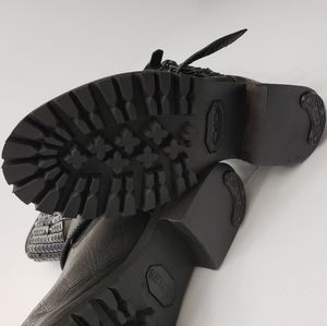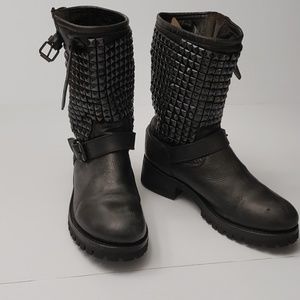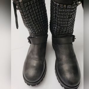 .. Black all leather studded ASH motorcycle boots,the top of boots amazing black studs ..toe is rounded the leather is very distressed style..with buckle accent strap . the back of left boot like when you pull it on is a bit dented in but totally fine...very cool!