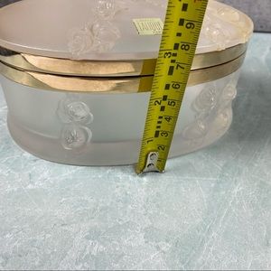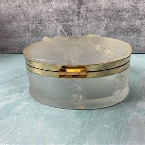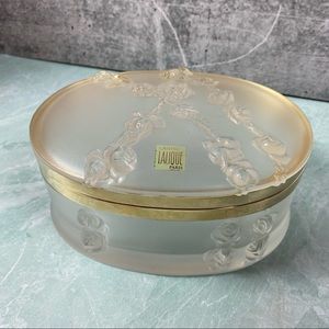 Oval Dressing Table Frosted Crystal Box Decorated with Embossed Roses by Lalique. The box is 6-3/4 inches long and 3-1/2 inches high.