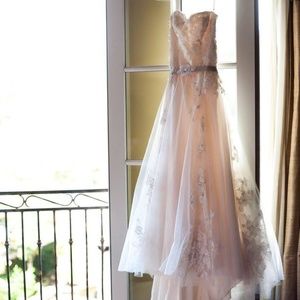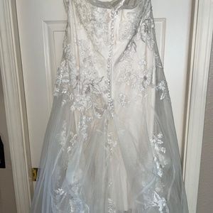I absolutely loved this dress on my wedding day, and ready to pass it on to someone else to love! The color is not white white, more ivory with some beige layers in the skirt and darker stitching in the bodice details. The skirt is flowy organza with lots of layers, and intricate floral lace detailing. I wore it with a tan colored belt with white lace detail. I can include the belt if you’d like. The current pictures have the back train pinned up.