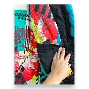 Be the coolest kid in town! Geometric zig zag stitching on arms. Size large. Funnel neck. Electric teal and black exterior and graffiti splash paint interior. So retro!!!!