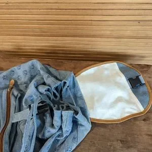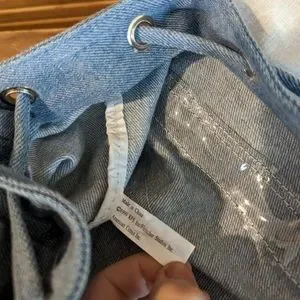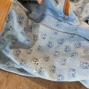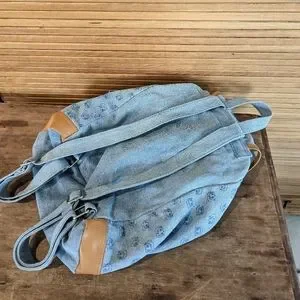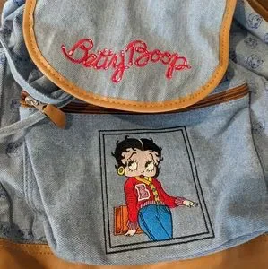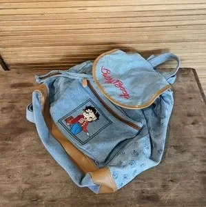vintage 1999 Betty boop backpack. denim with embroidered detail. cinches and has a buckle. some wear throughout, minor stains and has some small holes in side.