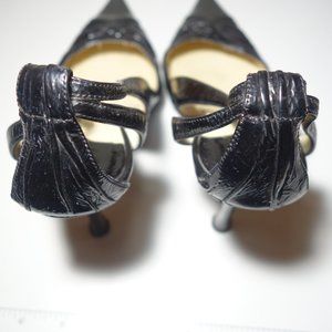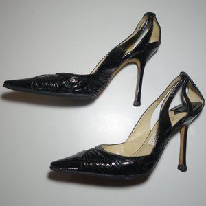 Jimmy Choo London black stiletto heels with pointy toe and leather ankle strap made in Italy.