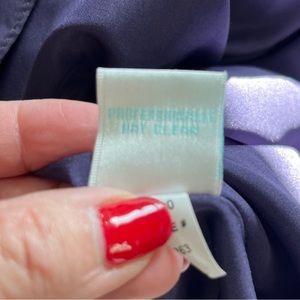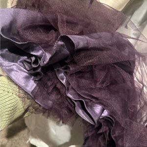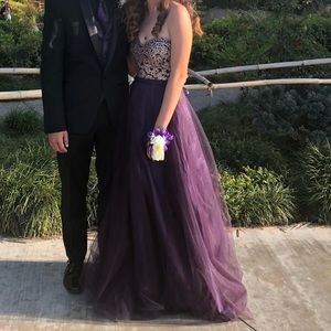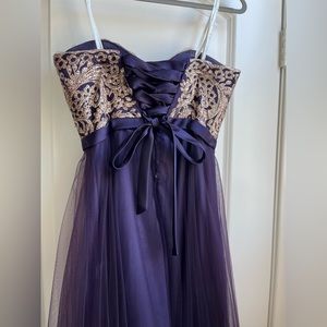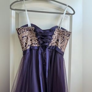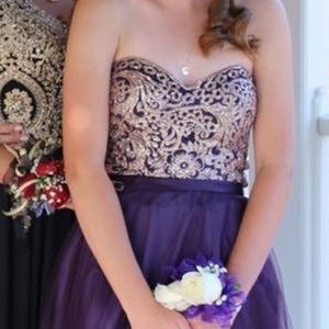 It’s Prom season! This dress is gorgeous! Strapless, full length, purple tool, gold embossed bodice, crisscross tie back, size 0, never dry cleaned, worn once, 100% polyester