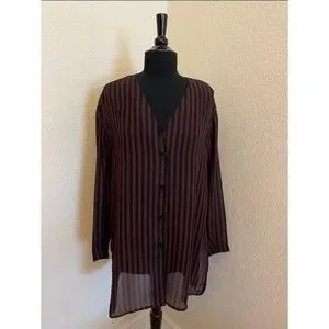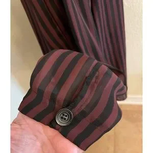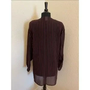 Polyester, burgundy and black stripes, sheer, buttons at the wrists, side slit on both sides, V neck. Vintage Roxy Wear, Size M