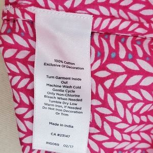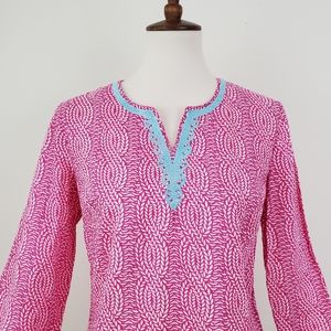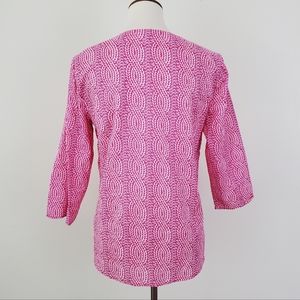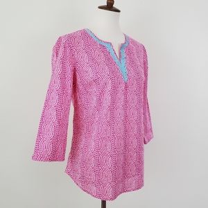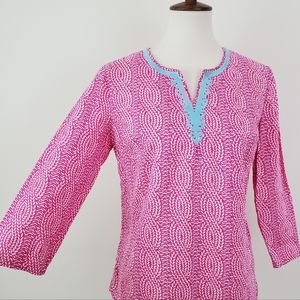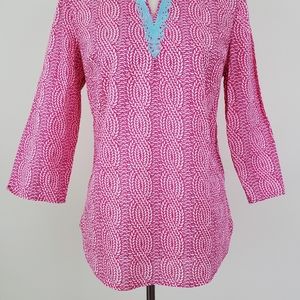 Talbots lightweight cotton boho tunic top with split V neckline and 3/4 length sleeves. Pink and white cable like print. Light blue embroidery along neckline on front. Perfect for spring and summer. Only worn a couple times. Excellent condition! Size Small