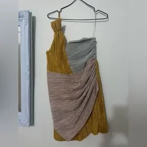 Size 10. Mini length. Fitted bust and waist. Worn a few times and there is a stain from a spilt drink on the front of the dress, however this is difficult to spot when on due to the material and texture of the dress.