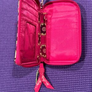 1. Vera Bradley Wristlet; Very Berry Paisley (retired pattern); 5.5” L x 3.5” H x .6” W; inside pockets with 1 clear ID pocket; one snap pocket on the back; colors described as pink, purple, and black.