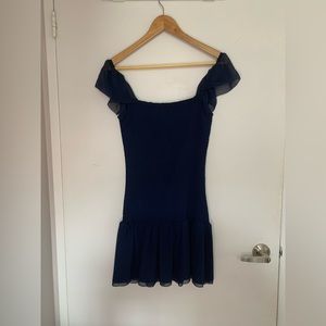 Do a little cha-cha-cha This is a mini dress with a smocked body, a flounced skirt and flutter sleeves. It's made from lightweight, semi-sheer fabric. In excellent condition, worn once. Fit: Slim — streamlined to fit close to the body Length: Above-the-knee Model is 5'10.5/179 wearing a size S On average, customers say it fits true to size