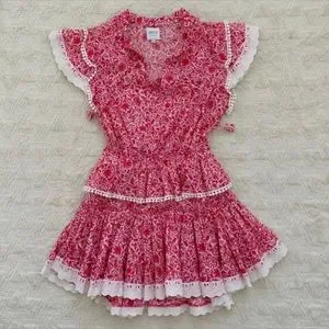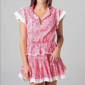 Fabric: Eyelet -Tiered skirt -Ruffle trim -Mini dress cut -V neck -Sleeveless -Tie at neckline -Hidden zip at back -Shell: 100% cotton -Partially lined -Lining: 100% cotton -Dry clean -Made in the USA