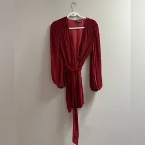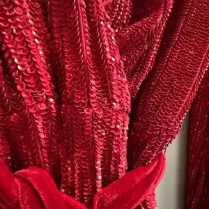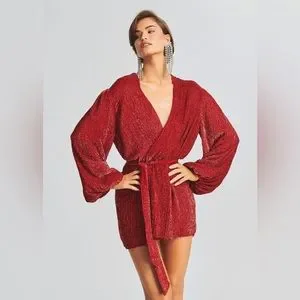 Introducing the ultimate party frock: The Gabrielle Robe. Enveloped in hand-stitched sequin embellishments, this timeless silhouette features a wrap bodice, which is complemented by voluminous blouson sleeves and a velvet tie belt to cinch the waist. For a micro mini moment, we recommend sizing down.