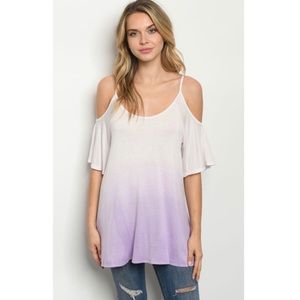 This ombré cold top in lavender and white features a cold shoulder short flutter sleeves.